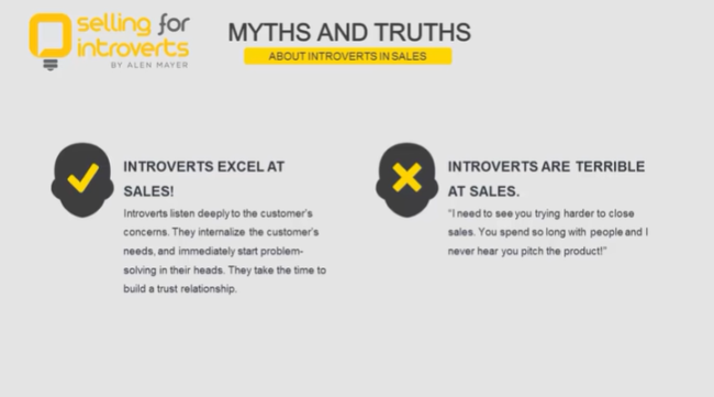Myth #15: Introverts are terrible at sales. Truth: Introverts excel at sales. Both extroverts and introverts can be stellar salespeople. The difference is in the execution: extroverts don’t mind cold…
